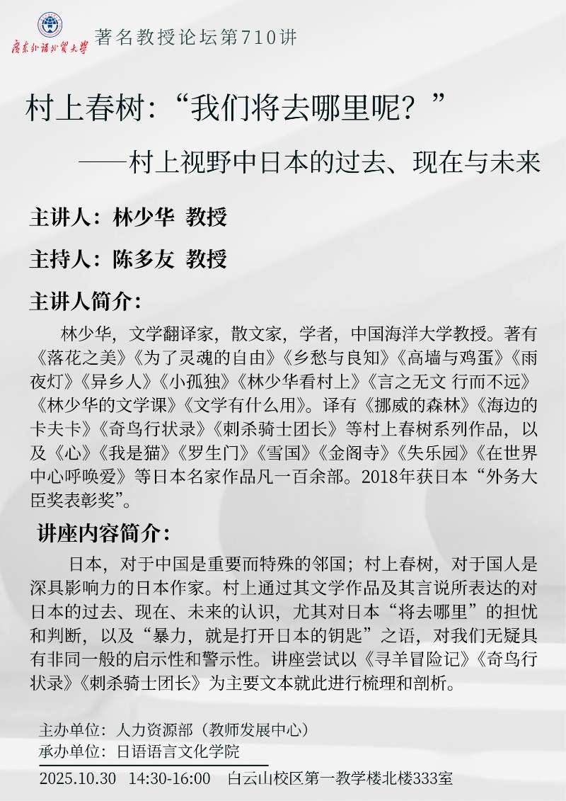 著名教授论坛第710讲:村上春树:“我们将去哪里呢?”——村上视野中日本的过去、现在与未来