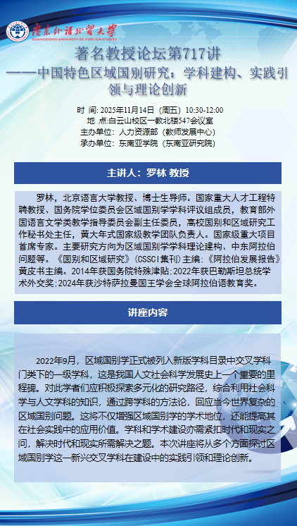 著名教授论坛第717讲:中国特色区域国别研究:学科建构、实践引领与理论创新