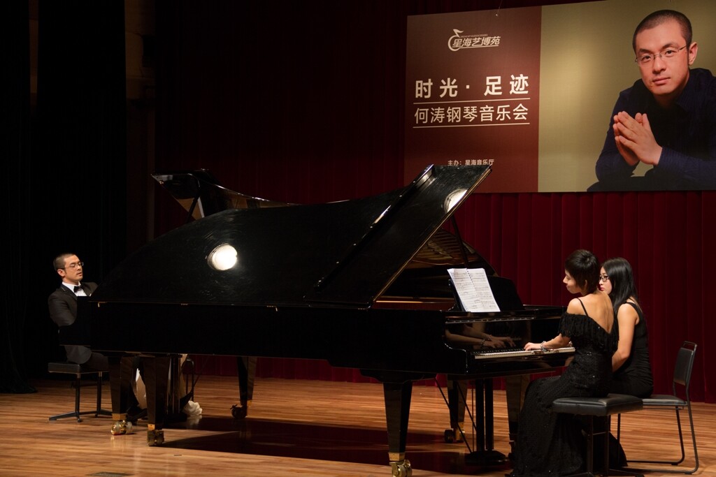 何涛选曲别具匠心,源自多年来在专业道路上孜孜求学的生活体验和心路历程。本场音乐会以两首肖邦的夜曲开场,恬静怡人,如天籁般的旋律缓缓流淌,带给了现场听众内心的平静。随后,由何涛和华南理工大学艺术学院的青年钢琴家冀璠合奏带来莫扎特的经典名作─《D大调双钢琴奏鸣曲》。灵动巧妙的触键、晶莹剔透的音色,两位演奏家在舞台上合作默契,将莫扎特作品中纯真浪漫、乐观向上的灵魂淋漓尽致地呈现在观众面前。