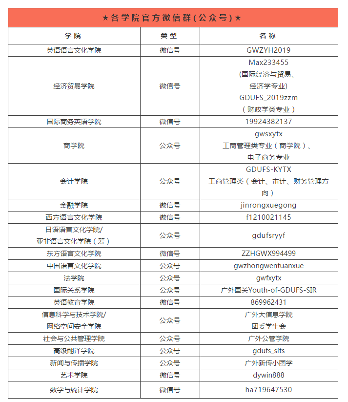 以下是各学院的迎新微信号、公众号。请新生通过申请添加或关注,再按学院指示统一拉入到学院官方微信群。