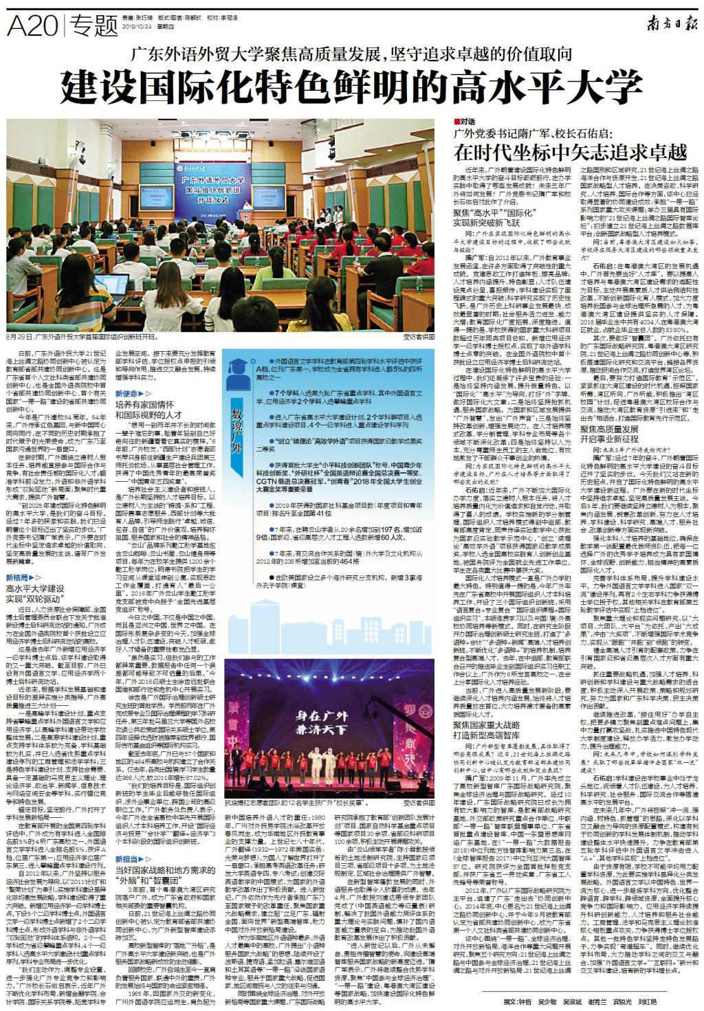 在新时期,广外围绕立德树人根本任务,培养能直接参与国际合作与竞争、有社会责任感的国际化人才;瞄准学科前沿发力,外语和非外语学科形成“双轮驱动”新局面;聚焦时代重大需求,提供广外智慧。