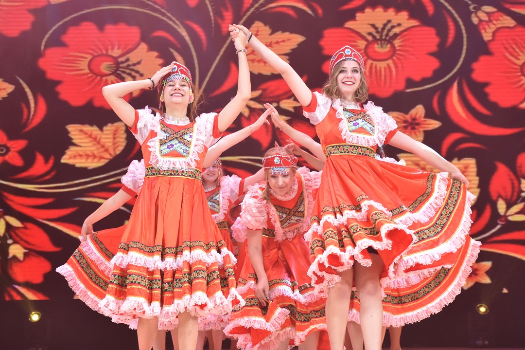 身着八角帽和红裙的舞者们一圈圈旋转,裙摆如花盛开,《情迷俄罗斯》进行到一半时,舞者换上现代服装,玩偶熊上场,舞者与熊共舞,引发台下一阵阵笑声,尽显青春活力。韩国留学生的舞蹈《告别》动感而不失优雅,用舞步点燃全场观众的激情。变幻的灯光随着音乐的节奏,在她们身上闪烁流动。音乐声与欢呼声交汇,口哨声与掌声交集,共同汇聚成现场观众对晚会的留恋与不舍。