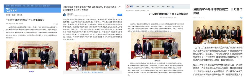 举行。作为全国首家涉外律师学院,广东涉外律师学院的成立引起光明网、中国日报网、南方网、广州日报等媒体关注报道。