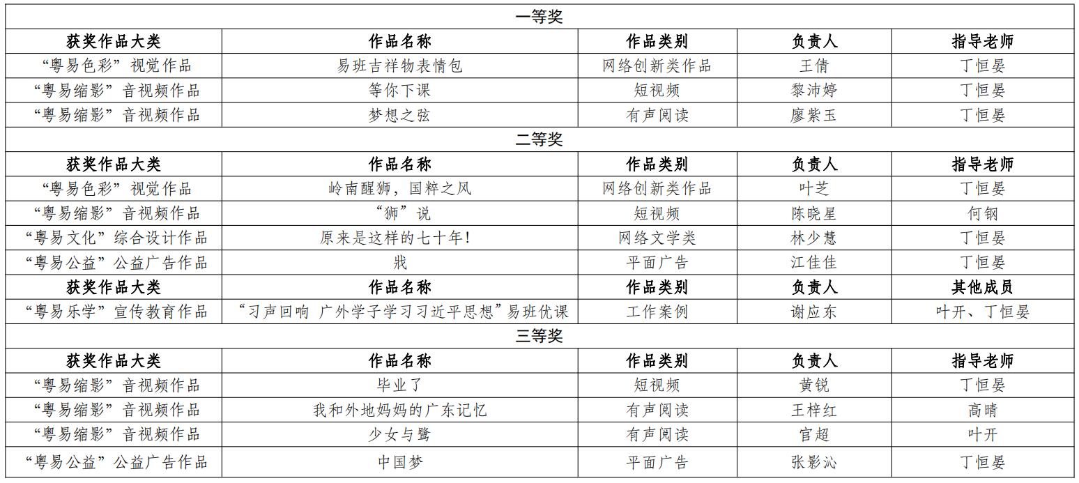 共有12项作品在此次评选中获奖。其中获“粤易色彩”视觉作品一等奖1项,二等奖1项;“粤易缩影”音视频作品一等奖2项,二等奖1项,三等奖3项;“粤易文化”综合设计作品二等奖1项;“粤易公益”公益广告作品二等奖1项,三等奖1项;“粤易乐学”宣传教育作品二等奖1项。福利导航