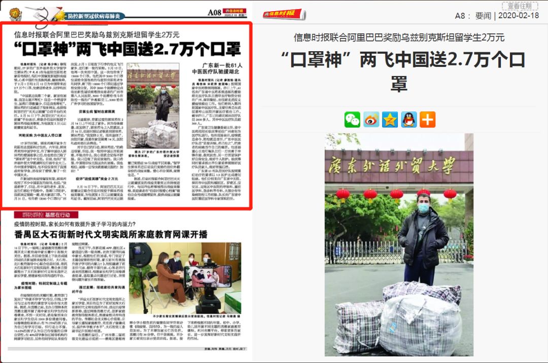 10天2次飞回中国,“人肉速递”近3万枚口罩到中国,赠予母校 、医院、老乡。郭沫若用他的行动诠释了一名国际留学生对中国的牵挂和支持,他的义举受到中央和省市媒体的密切关注报道,他的行动更成了国际好故事,甚至传回了他的祖国乌兹别克斯坦。