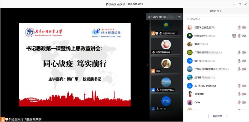 党委书记隋广军在线上为经贸学院180多名学子作主题为“同心战疫,笃实前行”的“思政第一课”。寄语青年学生发扬战疫精神,奉献力量,珍惜时光,努力学习,提升自我。