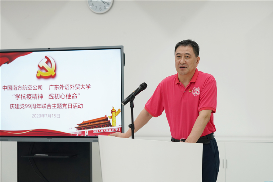南航客舱乘务一部总支书记郑竟成在致辞中表示,大学教给学生仰望星空思考人生的姿势,打开学生学习新知拓宽视野的窗户。南航员工不管走得多远,飞得多高,回首发现初心还在校园,教师的书香和墨香始终是他们人生的导航图。希望借助此次联合党日活动契机加深与广外的交流与合作。