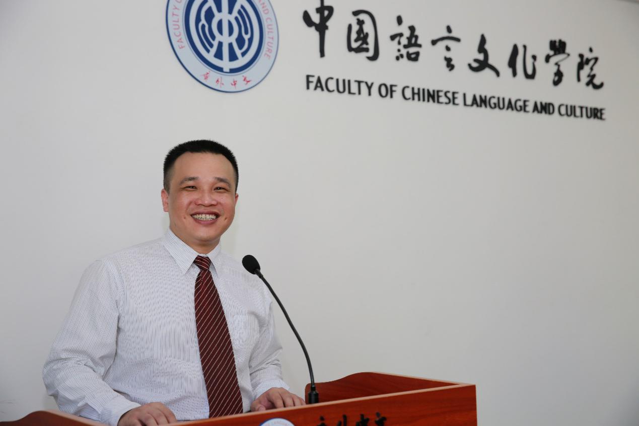 “知识要碎片化、要抓住学生的眼球、要充分挖掘古文背后的历史文化故事,从而更好地激发学生的学习兴趣。” 魏慧斌结合多年教学实践总结道。在古代汉语课堂上,学生们常常可以看见他手舞足蹈,用肢体动作来辅助展现汉字的起源,并在黑板上画图一步步演绎汉字的理据。“印象最深刻的是老师将手掌拍在黑板上留下手印,用粉笔稍加修改,便变成了一个熊掌式的图案,“逐”字变成两个脚印追赶着一只小猪的形象”,一位汉教2017级的学生饶有兴致地回忆道。此外,魏慧斌在讲授古汉语的音韵特点时,更是借助潮汕话、粤语、客家话等学生熟悉的母语方言进行举例,在他娓娓道来地情景式教学中,课本中抽象的叙述瞬间显得生动活泼了。