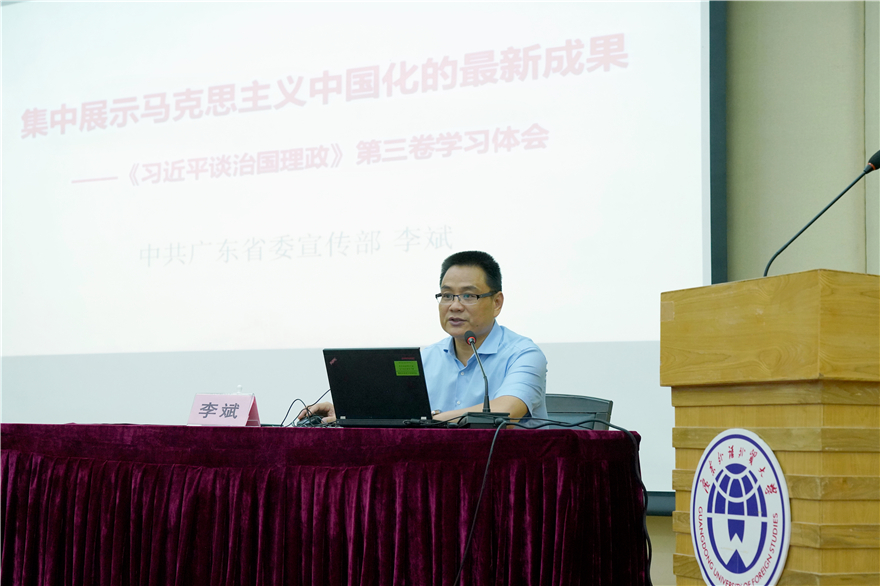 在北校区图书馆报告厅召开党委中心组(扩大)学习会,深入学习《习近平谈治国理政》第三卷。省委宣讲团成员、省委宣传部副部长李斌作题为《集中展示马克思主义中国化的最新成果》的专题辅导报告。会议由校党委书记隋广军主持。