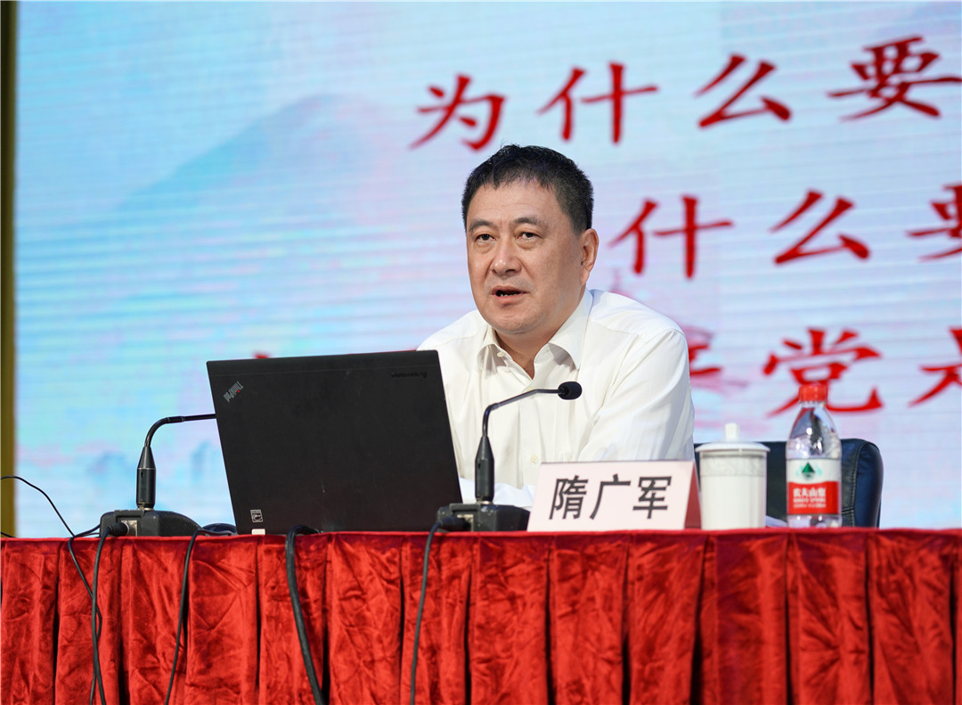 隋广军从“为什么要加入中国共产党”、“为什么要追随这个组织”、“中国共产党是一个什么样的组织”三个问题入手,深刻诠释了中国共产党人的初心和使命。隋广军表示,在疫情大考面前,广外人通过校园安全抗疫、志愿服务抗疫、学术舆论抗疫和国际同心战疫,各尽所能积极支援全国和全球抗击疫情,把初心使命写在抗疫斗争实践中,用实际行动展现了崇尚奉献、追求卓越的精神风貌。广外青年学子应弘扬抗疫精神,做到忠诚、自信、诚信、正直、卓越、担当,不断地提升素质、增强本领,为实现中国梦而努力奋斗。