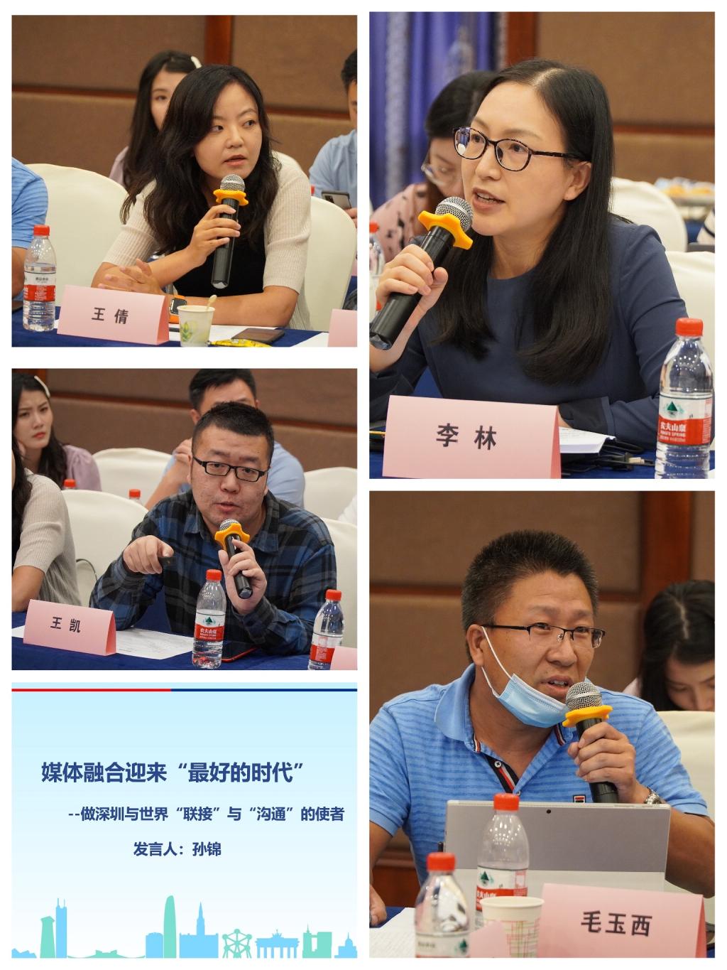 基地第一届学员代表首先进行主题发言。《羊城晚报》政文部文教室主任王倩结合自身工作实践,以“从广东新闻阅评谈如何做好主题宣传工作”为主题进行分享;《南方英文网》主任助理王凯以“换一种方式与世界互动”为题,从为什么换和怎么做两方面进行分享;广州广播电视台首席编导、纪录片中心主管,高级编辑李林以“纪录片—中国故事的国际表达”为主题,重点讲述了国际传播的叙事策略;《广州日报》报纸编辑部副主任毛玉西以“媒体融合实践的五维思考”为主题,重点讲述媒体融合实践的五个维度和如何提高新闻业务论文质量;深圳市坪山融媒体中心、坪山国际化城区推广中心主任孙锦从国际传播视角,带来了“媒体融合迎来‘最好的时代’—做深圳与世界‘联接’与‘沟通’的使者”线上分享。