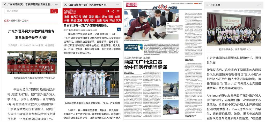 智库、国际合作和媒体资源,主动作为,配合国家做好疫情防控对外宣传和国际舆论工作。具体做法概括为打好“外”字牌,用好“三个外”:巧用“外力”,发挥外籍教师、留学生、国际合作院校友人以及本土外语教师力量为中国抗“疫”发声;借用“外媒”:利用国际媒体资源构建海外传播渠道;善用“外脑”:以智库产品和学术文章参与国际舆论斗争。在此基础上实现了三个方面的效应:一是形成多媒体联动的传播效应,有效地向国际社会讲述中国战“疫”好故事;二是形成真实可靠的人际传播效应,有效地增进国际社会对中国抗“疫”实情的了解;三是形成多话语跨文化的传播效应,有效地提升中国抗“疫”的国际信任度。