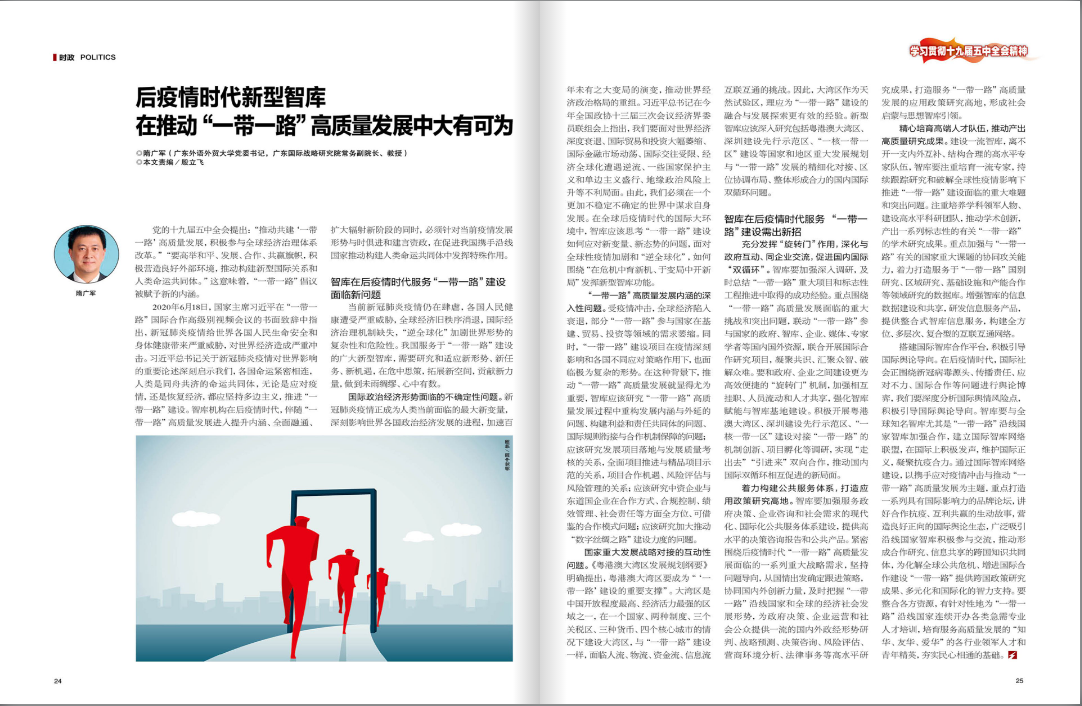 党委书记、广东国际战略研究院常务副院长隋广军教授理论文章《后疫情时代新型智库在推动“一带一路”高质量发展中大有可为》在《南方》刊登,文章从党的十九届五中全会提出的“推动共建‘一带一路’高质量发展,积极参与全球经济治理体系改革”切入,重点剖析了智库在后疫情时代服务“一带一路”建设面临的新问题与新对策。