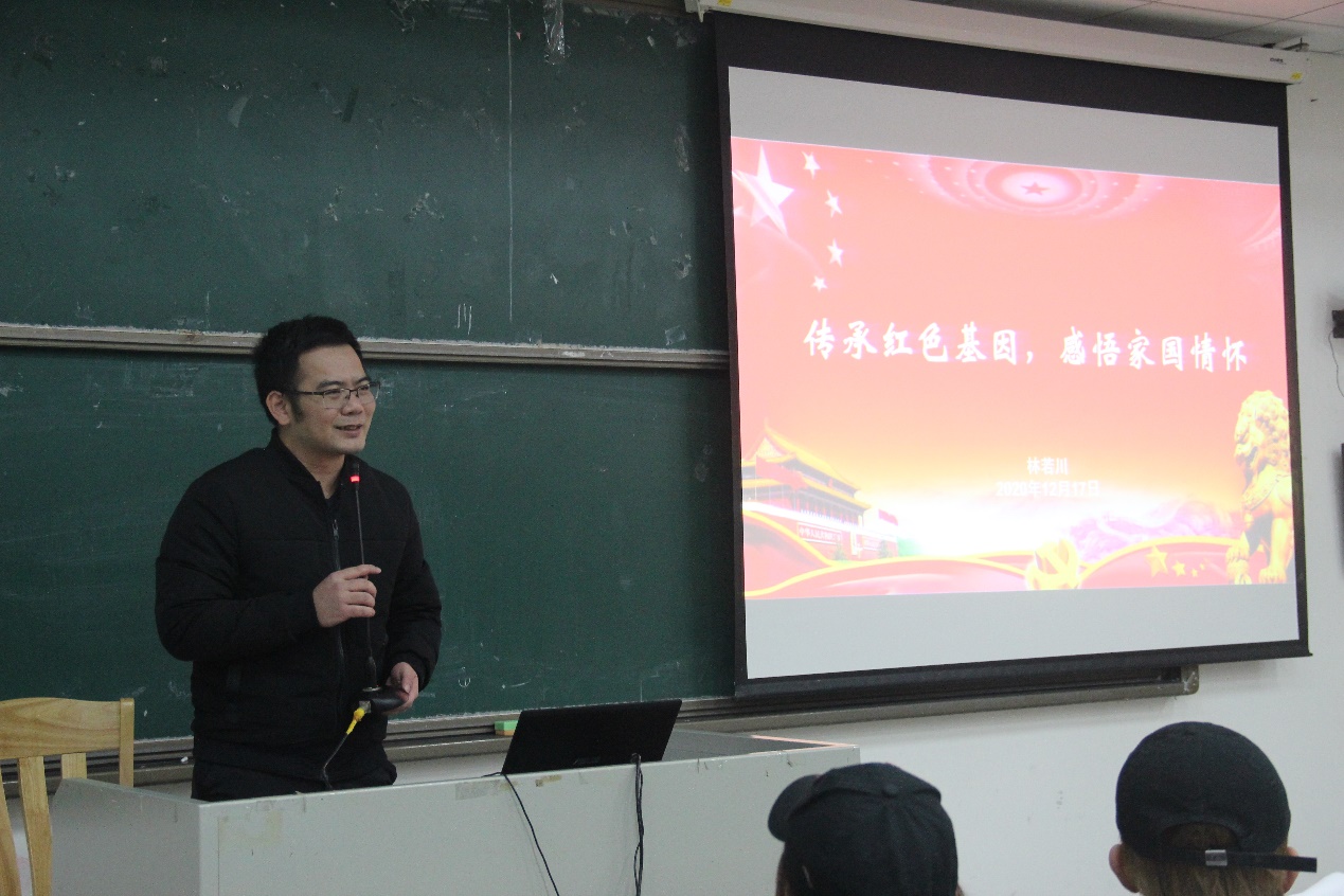 2003级校友林若川为国际学院师生讲述“传承红色基因,感悟家国情怀”专题。国际学院领导班子、师生共150余人参加讲座。