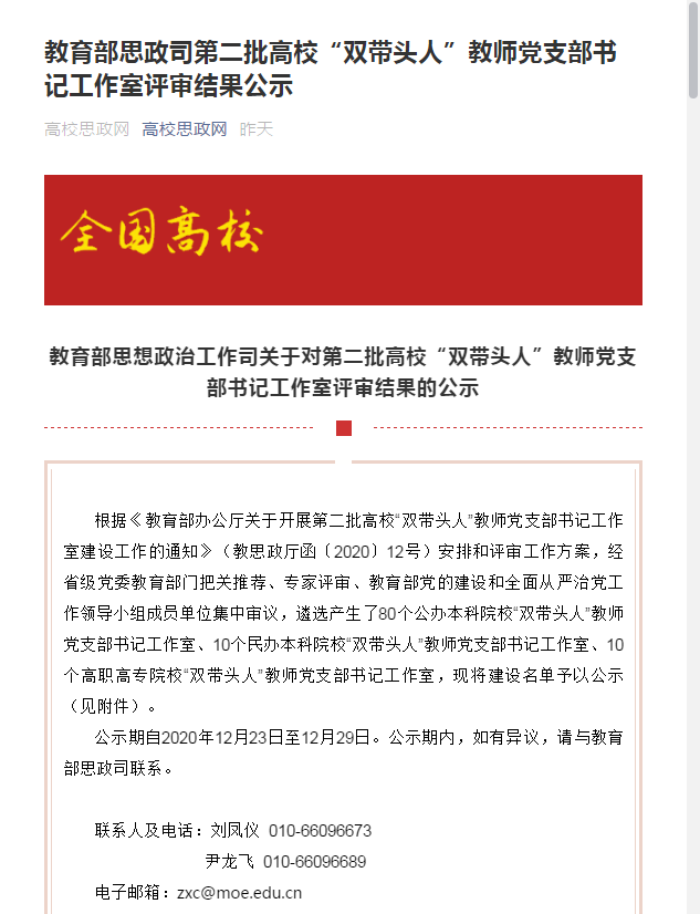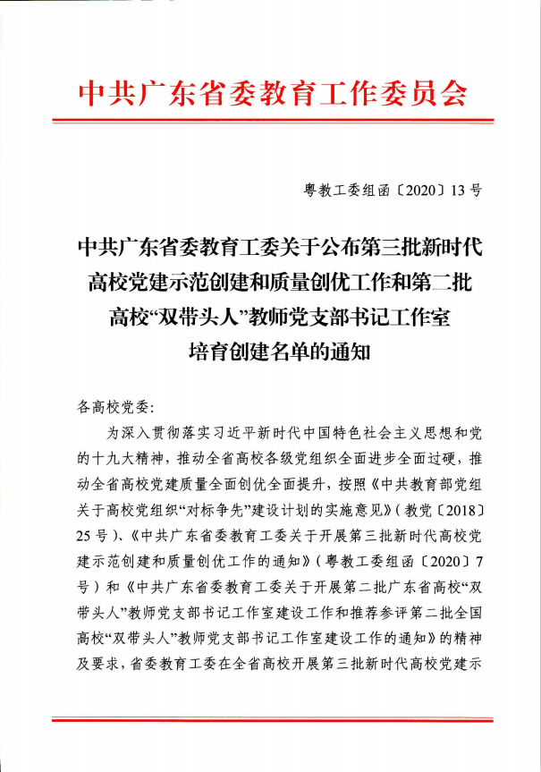 本网讯 近日,教育部思政司、省委教育工委公布了全国、全省“双带头人”教师党支部书记工作室以及第三批全省党建“双创”(新时代高校党建示范创建和质量创优)工作创建立项结果。