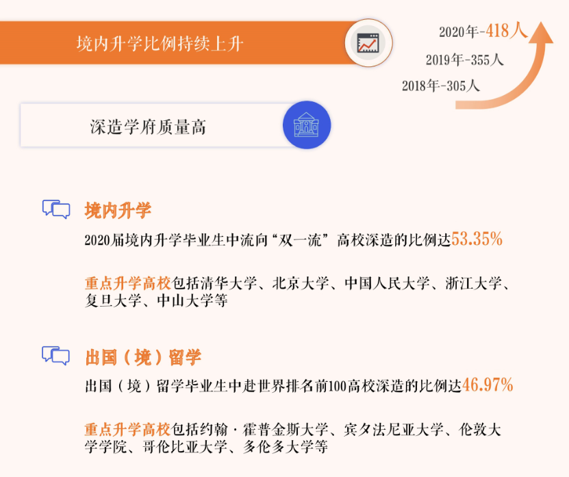 2020届毕业生升学深造总人数为1046人,占比17.73%,其中本科生升学深造997人,占本科生人数的20.95%。2020届毕业生境内升学总人数为418人,较2019届增加63人。境内升学毕业生中流向“双一流”高校深造223人,比例达53.35%,较2019届大幅提升。2020届毕业生出国(境)留学628人,到世界大学排名前100高校深造295人,比例达46.97%,较2019届提高9.15%。