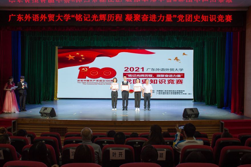 本次大赛设知识抢答、视听比拼和主题演讲三个环节。在知识抢答环节,20名来自各学院的优秀选手以高昂的精神、充分的知识储备,为观众呈现了一场精彩纷纭的学习盛宴。紧接着进入以图片、音乐、视频形式的视听比拼环节,选手们的精彩发挥,赢得现场阵阵掌声。在主题演讲环节,6名晋级选手分别以《青春心向党》和《无奋斗,不青春》为主题进行演讲,选手们风采卓然,演讲铿锵有力,充分体现出新时代青年积极向上、奋发有为的精神面貌。来自商英学院的翟霖同学获得了“党团之星”的荣誉称号。