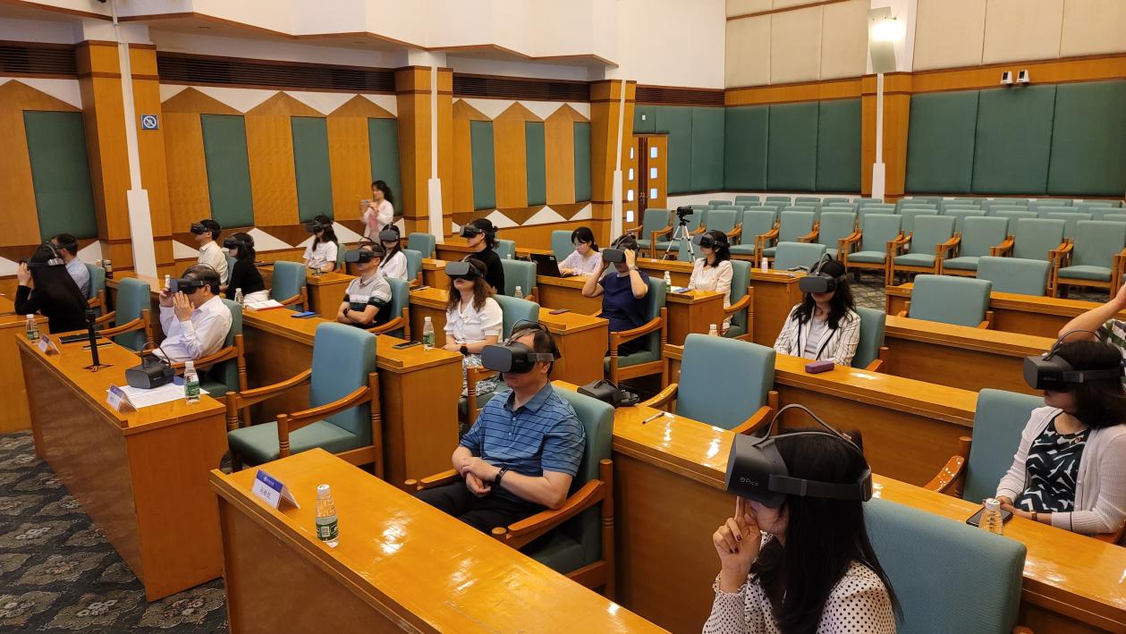 未来发展。学习会由国际交流党总支书记柯晓华主持。上海徐汇国青公益事业发展中心为VR党史学习课提供技术支持。