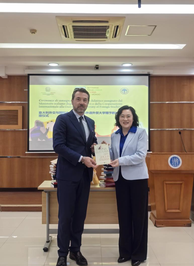 赠送由意大利外交与国际合作部提供的书籍,这些书籍将成为师生们探索意大利语言文化的 “忠实旅伴”,帮助大家更深入地了解意大利的传统与文化。最后,他预祝本届 “世界意大利语周” 圆满成功,并期待中意双方的合作与交流持续深化。