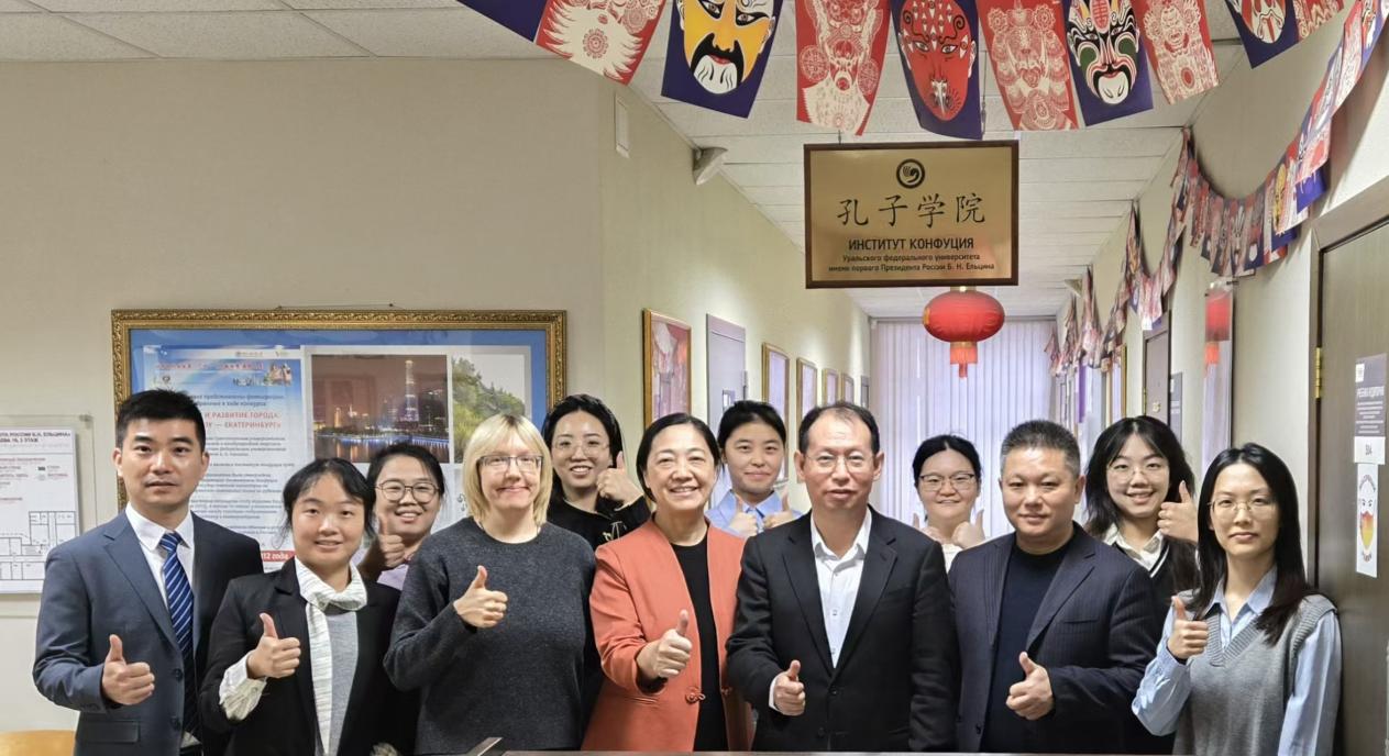 代表团赴叶卡捷琳堡访问乌拉尔联邦大学及乌联大孔院。该校分管国际交流事务的图申·谢尔盖·根纳季耶维奇副校长一行与广外代表进行座谈。图申表示,中俄人文交往和经贸关系密切,两校合作关系紧密,特别在孔院合作共建和学生互派方面已有长期合作基础;希望加强师生互访和学术交流,拓展师生合作范畴,提高交换生数量。申明浩回应,自2011年两校合作共建孔子学院以来,乌联大孔院已成为乌拉尔地区中文教育的重要平台。在继续合作共建孔院的基础上,未来两校有许多合作和发展的空间,可以在学科建设包括人文艺术、经贸、管理和法律等专业建设,以及共同进行期刊投稿和开展科研方面深化合作。双方对进一步完善孔院建设、加强基础设施建设,以及进一步拓宽校际交流渠道、建立师生交流常态化机制等方面达成多项共识。