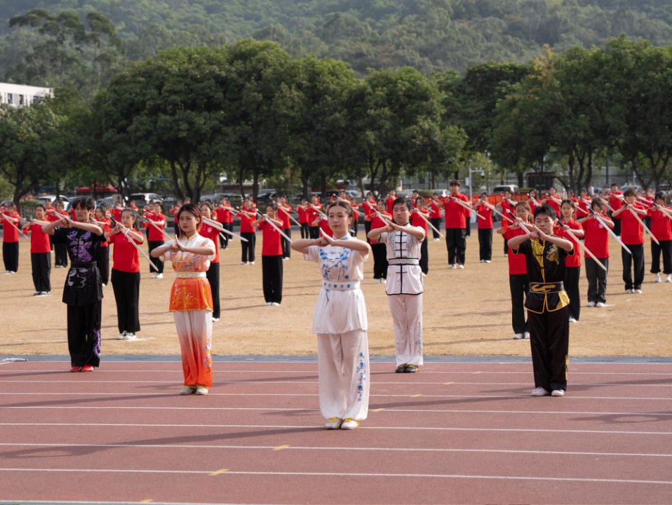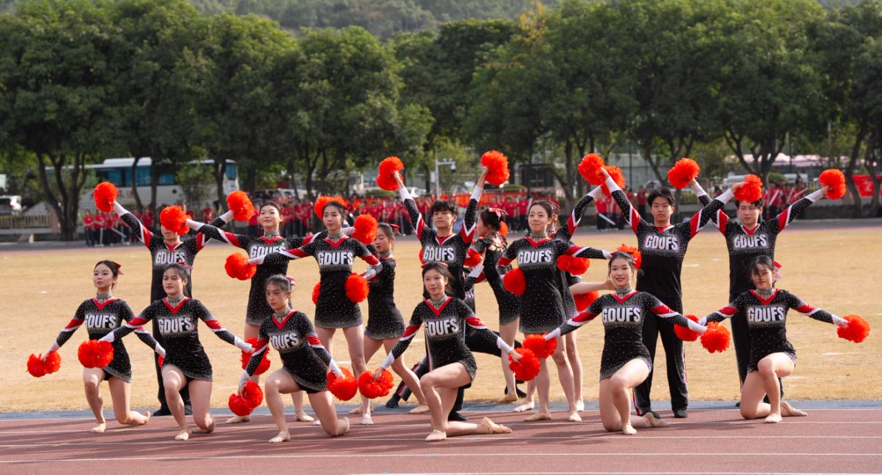 开幕式上,四只醒狮腾跃登场,时而灵动嬉戏,时而威风凛凛,吐露出“步步高升”“鹏程万里”的对联,将传统民俗的魅力展现得淋漓尽致,瞬间点燃现场氛围。啦啦操队踩着明快节奏,旋转、跳跃、托举,身姿靓丽又充满张力,手中花球如火焰般跃动,她们灿烂的笑容与奔放的热情,形成一道极具感染力的风景线。带来跆拳道表演的同学们动作刚劲有力,踢腿、出拳一气呵成,在刚柔并蓄中尽显少年锐气与武者风范。由10位同学领舞、300余人组成的武术团体操表演气势恢宏。同学们的动作舒展而充满力量,整齐划一又刚柔并济的队形与招式,诠释了中华武术的博大精深,也彰显出广外学子的昂扬风貌。