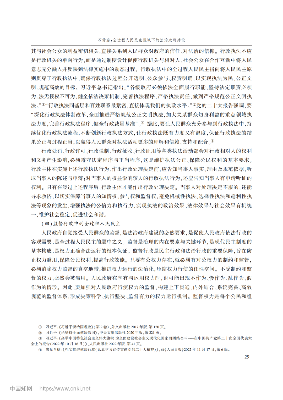 论文指出,全过程人民民主是中国特色社会主义民主政治的本质属性,是实现国家治理现代化的制度基石,为法治政府建设提供了基本遵循。全过程人民民主视域下的法治政府建设具有深厚的理论逻辑,彰显了人民至上的价值理念。法治政府建设的出发点是为了人民,着力点是依靠人民,落脚点是保护人民权益,增长点是回应人民新期待。全过程人民民主是法治政府建设的内在要求,贯穿于法治政府建设的始终,体现在行政立法、行政决策、行政执法、监督行政的具体实践中,为新时代推进法治政府建设注入新动能。应全面推进政务公开,健全人民群众参与法治政府建设的程序规则,创新人民群众参与法治政府建设的方式,增强人民政府对人民群众诉求的回应性,以全过程人民民主赋能法治政府建设,提升法治政府建设的质效,充分发挥法治政府建设在中国法治现代化建设中的支撑作用。