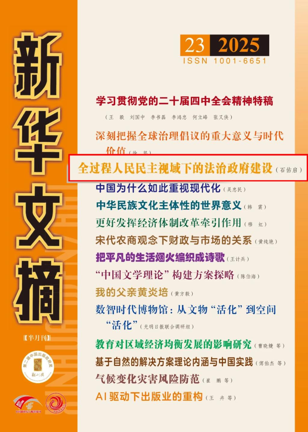 本网讯 近日,《新华文摘》2025年第23期全文转载校党委书记石佑启教授《全过程人民民主视域下的法治政府建设》一文。该文原载于《现代法学》2025年第4期。